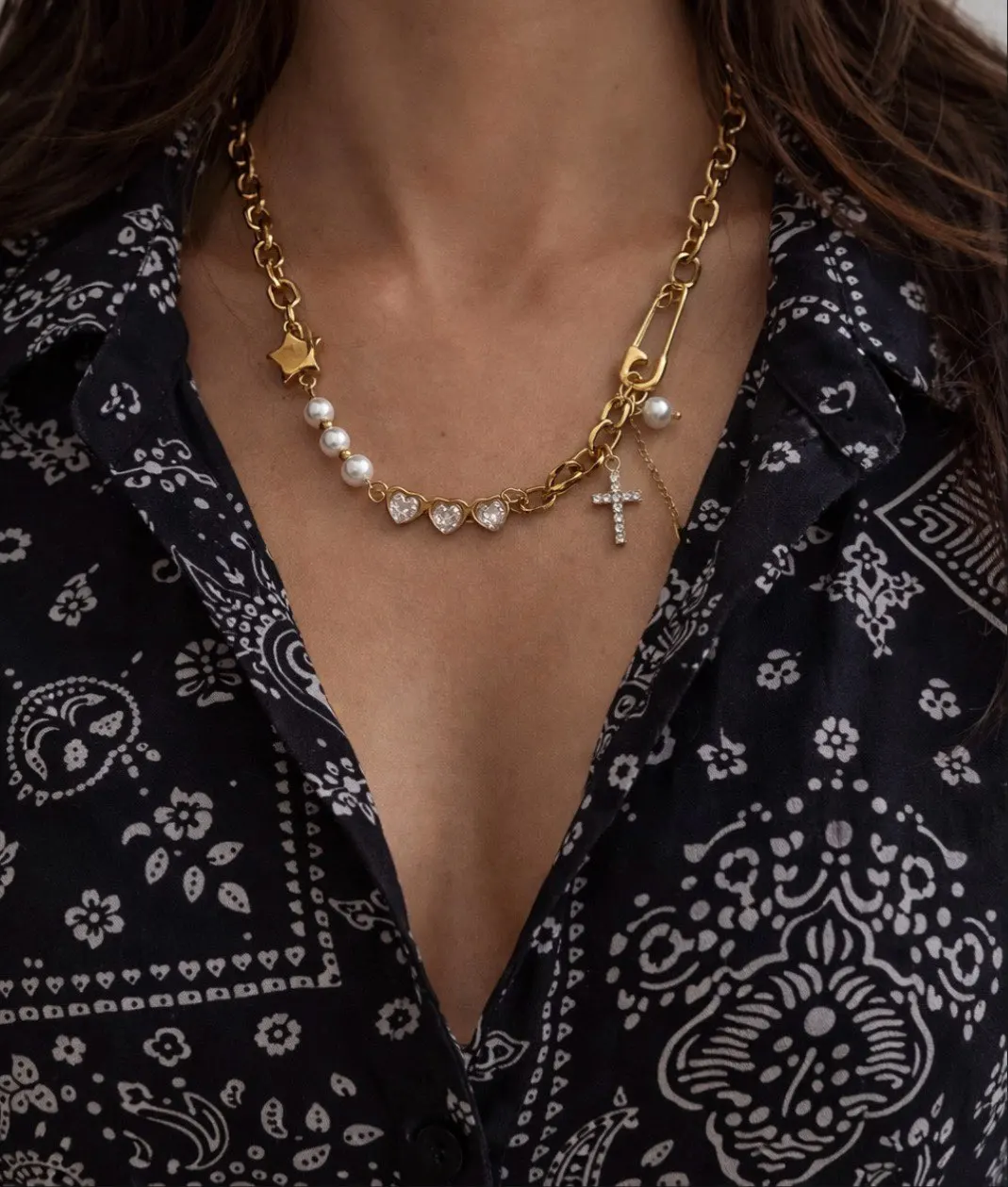 The Zia necklace blends bold chain links with delicate symbolic charms, creating a layered look in one refined piece. Designed to stand out, it balances strength and softness with pearls, hearts and cross detailing.
